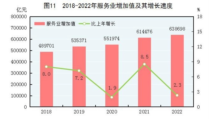 全年批發(fā)和零售業(yè)增加值114518億元,比上年增長0.9%;交通運(yùn)輸、倉儲和郵政業(yè)增加值49674億元,下降0.8%;住宿和餐飲業(yè)增加值17855億元,下降2.3%;金融業(yè)增加值96811億元,增長5.6%;房地產(chǎn)業(yè)增加值73821億元,下降5.1%;信息傳輸、軟件和信息技術(shù)服務(wù)業(yè)增加值47934億元,增長9.1%;租賃和商務(wù)服務(wù)業(yè)增加值39153億元,增長3.4%。全年規(guī)模以上服務(wù)業(yè)企業(yè)營業(yè)收入比上年增長2.7%,利潤總額增長8.5%。