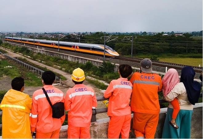 在印度尼西亞萬隆,雅萬高鐵建設(shè)者和當?shù)孛癖娪^看高速鐵路綜合檢測車行駛在雅萬高鐵試驗段(無人機照片)。新華社發(fā)(李培養(yǎng) 攝)