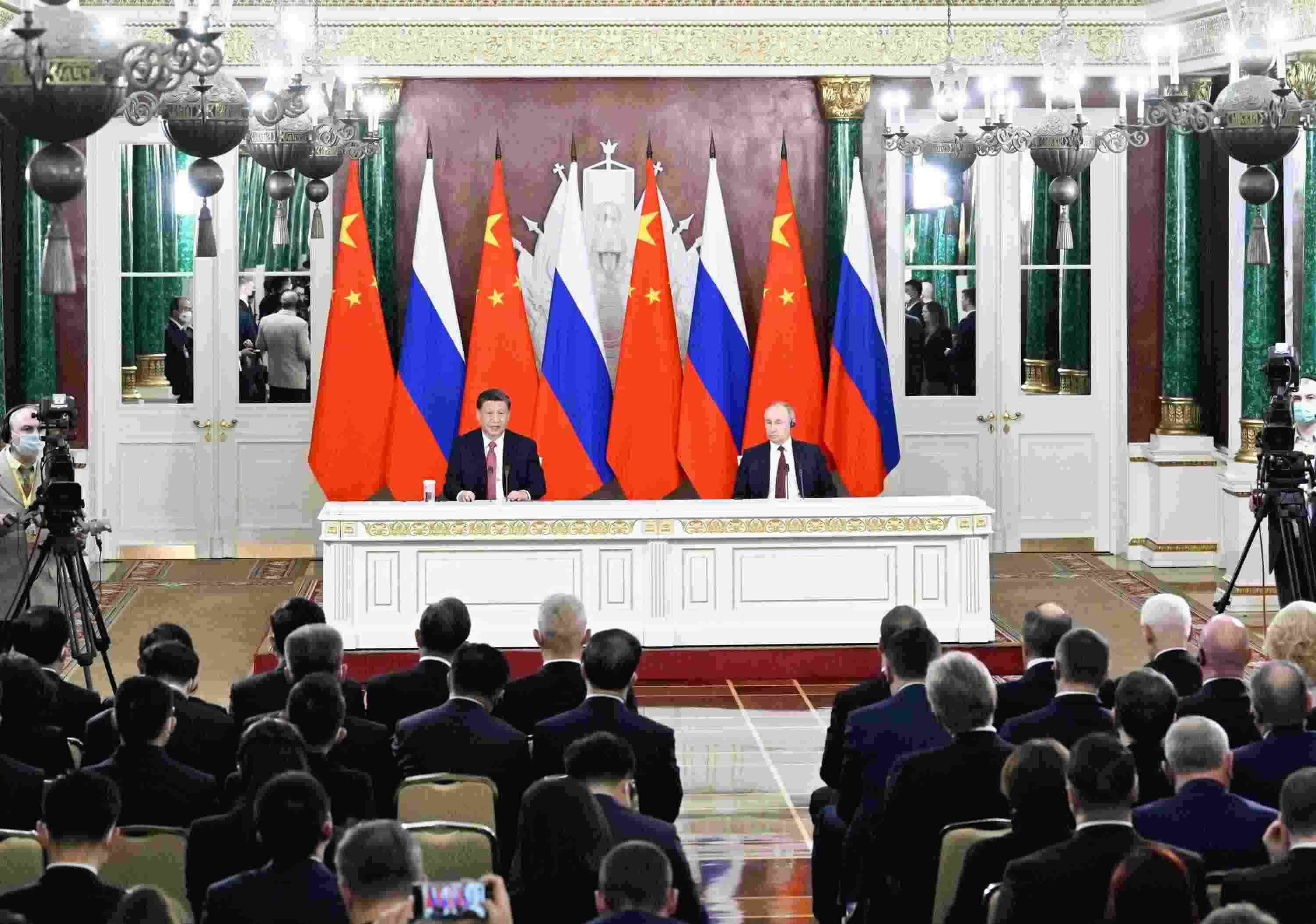 當?shù)貢r間3月21日下午,國家主席習(xí)近平在莫斯科克里姆林宮同俄羅斯總統(tǒng)普京舉行會談。這是會談后,兩國元首共同會見記者。