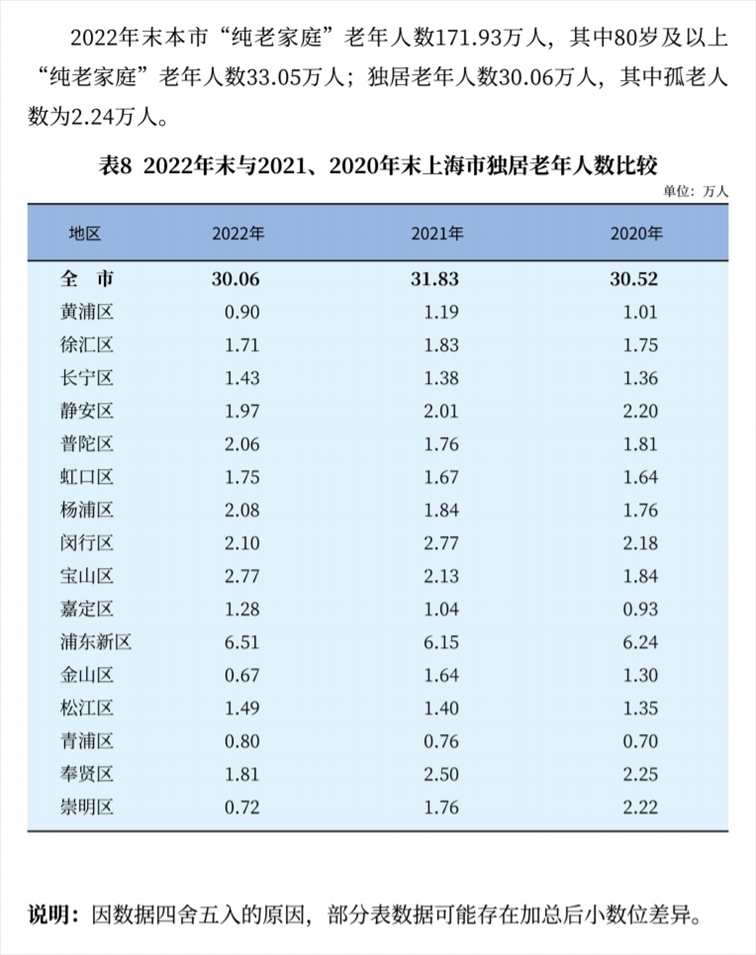 統(tǒng)計(jì)數(shù)據(jù)還顯示,2022年末,上海獨(dú)居老年人數(shù)30.06萬人,其中孤老人數(shù)為2.24萬人。