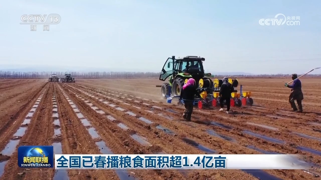央視網(wǎng)消息(新聞聯(lián)播):農(nóng)業(yè)農(nóng)村部最新農(nóng)情調(diào)度顯示,截至目前,全國(guó)已春播糧食面積超1.4億畝,各地多措并舉,高質(zhì)量推進(jìn)春季農(nóng)業(yè)生產(chǎn)。