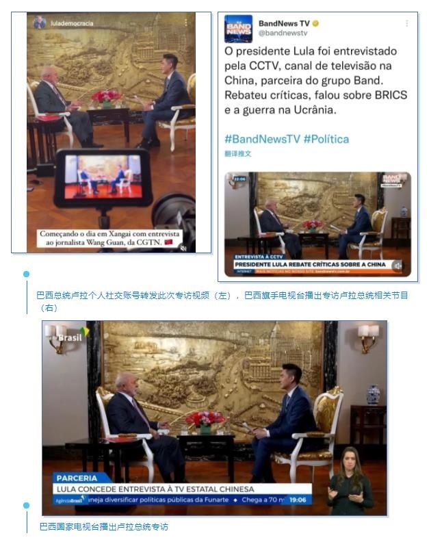 盧拉總統(tǒng)在其個人社交賬號轉(zhuǎn)發(fā)此次專訪視頻。巴西第二大電視臺旗手電視臺綜合頻道,在當?shù)貢r間4月14日晚率先播出總臺《高端訪談》專訪盧拉總統(tǒng)的精華版,觸達巴西全境,完整版專訪于次日在該臺各頻道多次播出。巴西最大新聞門戶網(wǎng)站UOL、知名雜志《論壇》等也陸續(xù)上線本次專訪節(jié)目。