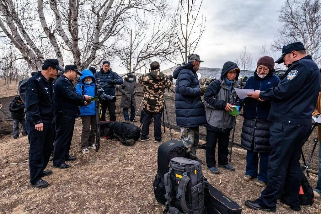 4月17日,民警在向攝影愛好者宣傳鳥類保護知識。(宿海東 攝)