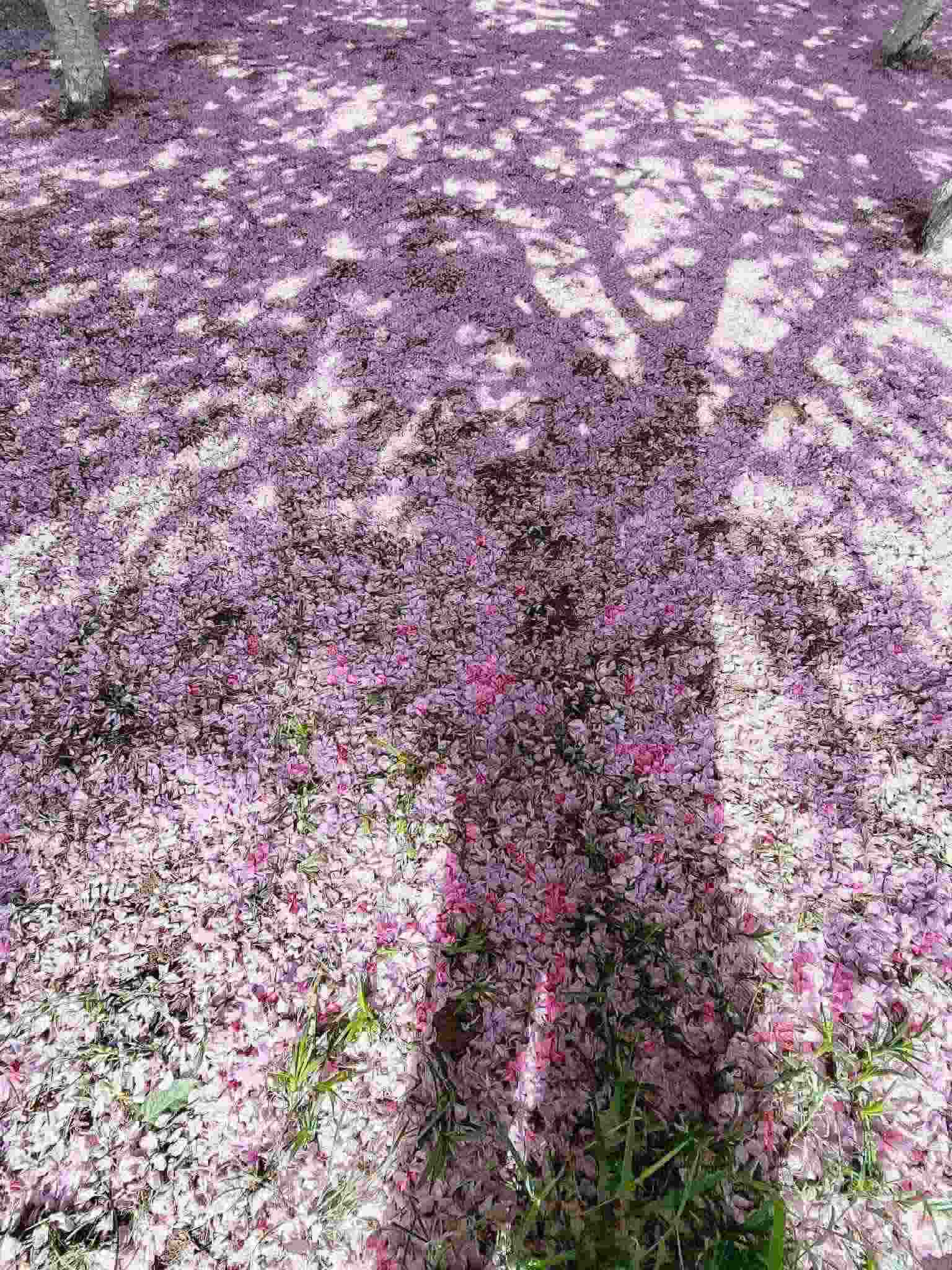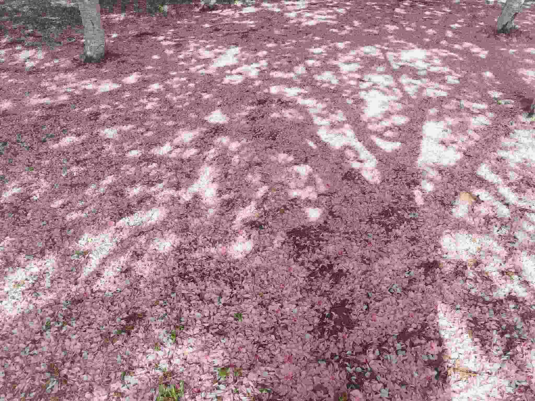 2023年4月29日,青島中山公園,經歷風雨之后,櫻花樹下落了厚厚一層花瓣。視覺中國
