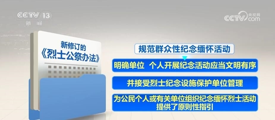 新修訂的《烈士公祭辦法》自5月1日起施行。其中,強調(diào)發(fā)揮公祭活動對青少年的教育作用,要求各級各類學校組織學生以適當方式參加烈士公祭,加強愛國主義、集體主義、社會主義教育。規(guī)范群眾性紀念緬懷活動,明確單位、個人開展紀念活動應當文明有序,并接受烈士紀念設施保護單位管理,為公民個人或有關(guān)單位組織紀念緬懷烈士活動提供了原則性指引。