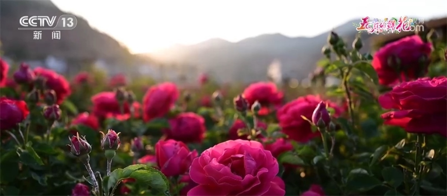 現在我們看到的是位于云南省姚安縣光祿古鎮(zhèn)的數千畝食用玫瑰。群山環(huán)抱下,滇紅、墨紅等玫瑰花次第綻放。