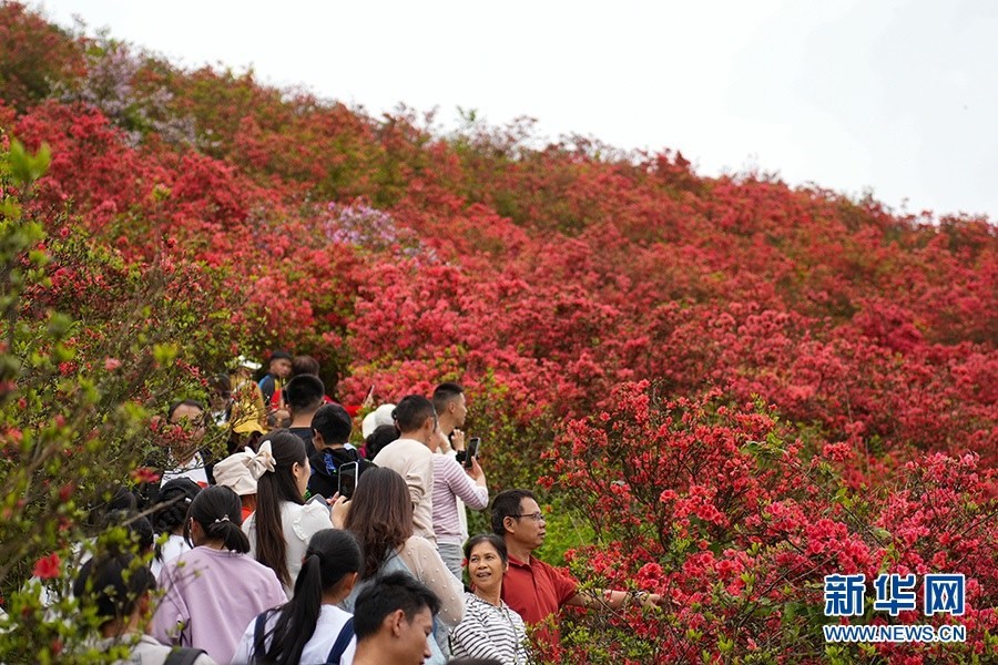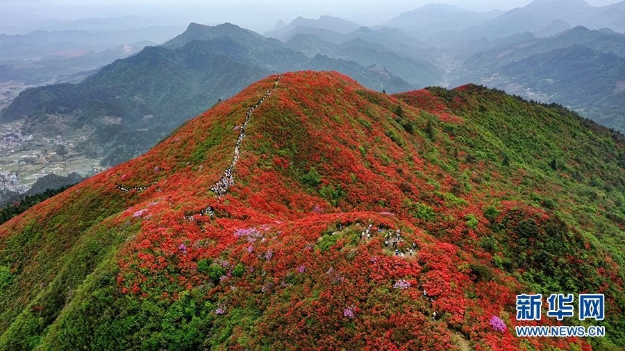 當(dāng)日,在貴州省黔東南苗族侗族自治州丹寨縣縣城邊海拔1400多米的龍泉山,萬(wàn)畝杜鵑花競(jìng)相綻放,山谷間、棧道旁、懸崖上,一顆顆、一簇簇、一朵朵杜鵑花迎風(fēng)搖曳,形成浩瀚花海,引來(lái)眾多游客登高望遠(yuǎn),飽覽靈山秀水之美。