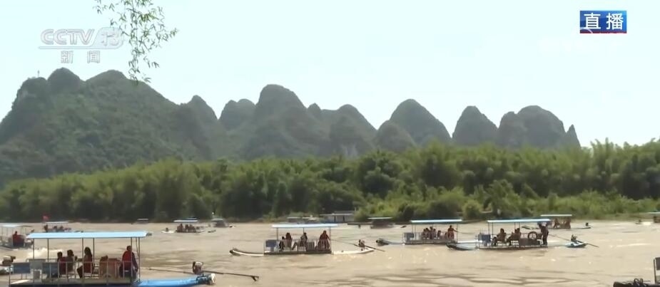 桂林山水甲天下,漓江沿線正是桂林山水最典型的代表?,F(xiàn)在已經(jīng)是廣西的汛期,降雨開始增多。大家通過畫面可以看到,漓江的水不像前幾天那樣清澈,這是因?yàn)榍疤?,桂林剛剛?jīng)過一場(chǎng)強(qiáng)降雨,上游來水增加。在漓江之上,無論陰晴雨霧,都是不同的風(fēng)景。像今天這樣的晴天麗日,在漓江上穿行就像在欣賞一幅青綠山水;而在陰雨天,又像是穿行在傳統(tǒng)的水墨畫之中。根據(jù)桂林海事部門預(yù)測(cè),“五一”假期,桂林水上發(fā)送旅客量超過30萬人次,這幾天旅游公司的船票基本上都是提前售完的狀態(tài)。
