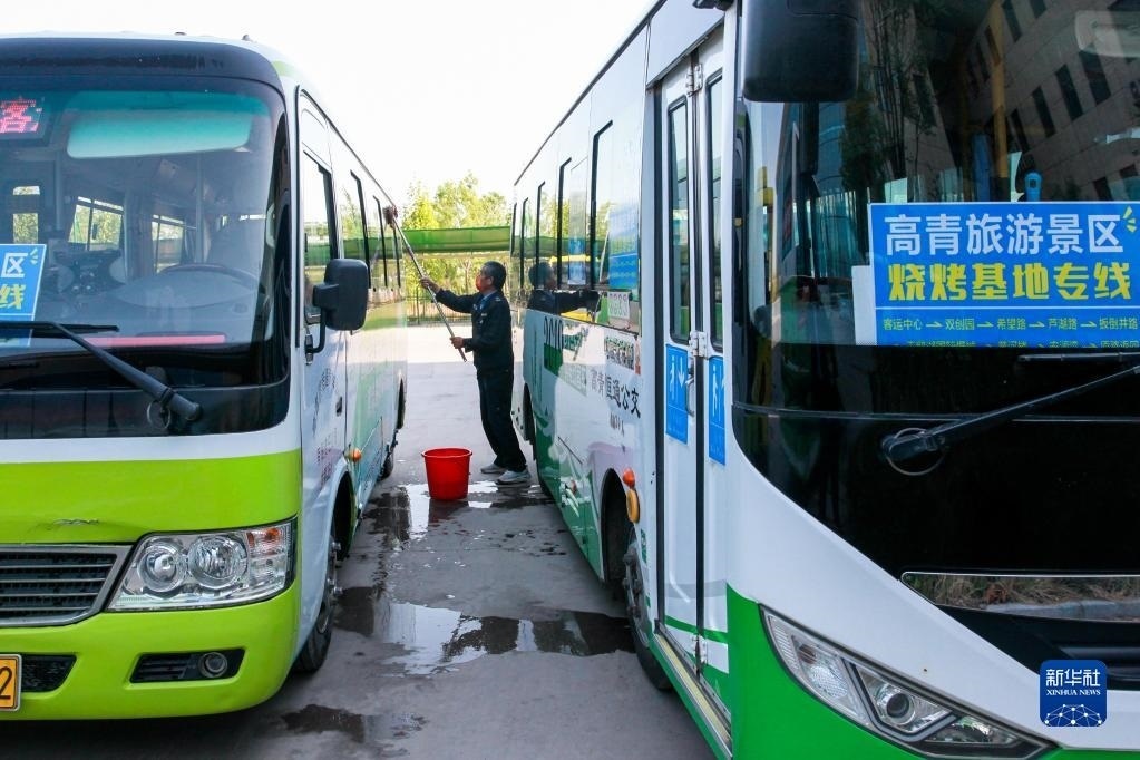4月29日,在淄博市高青縣客運站,一名司機在保養(yǎng)車輛。當(dāng)?shù)赝瞥?元“燒烤公交”專線方便游客出行。