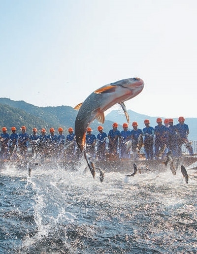 浙江省杭州市淳安縣千島湖國(guó)家級(jí)水產(chǎn)種質(zhì)資源保護(hù)區(qū)內(nèi),漁民在進(jìn)行“巨網(wǎng)捕魚(yú)”。謝航凱攝(影像中國(guó))
