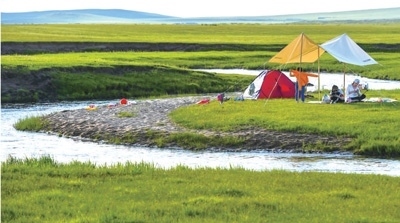 內(nèi)蒙古自治區(qū)錫林郭勒盟西烏珠穆沁旗綠草如茵,游客在河畔露營(yíng)。新華社記者 彭 源攝