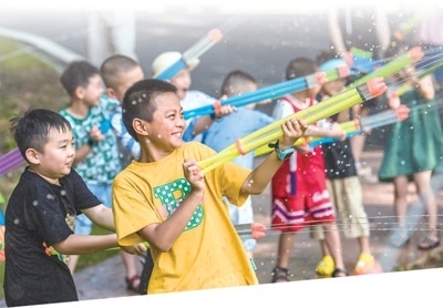 安徽省蕪湖市孫村鎮(zhèn)一家鄉(xiāng)村房車露營(yíng)地里,小朋友們?cè)陂_(kāi)心地打水仗。肖本祥攝(人民視覺(jué))