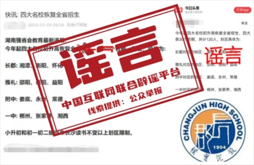 真相:近日,一些網(wǎng)站和自媒體平臺發(fā)布“今年起,長郡中學(xué)、雅禮中學(xué)、湖南師大附中、長沙市一中等長沙‘四大名校’初升高恢復(fù)全省招生”的信息引發(fā)關(guān)注。5月4日,湖南省教育廳對此發(fā)布聲明稱,此消息為不實(shí)消息。湖南省自2021年全面規(guī)范普通高中招生,禁止跨區(qū)域招生,并對違規(guī)招生行為進(jìn)行嚴(yán)肅查處。請大家不信謠不傳謠。(來源:湖南省教育廳微信公眾號)