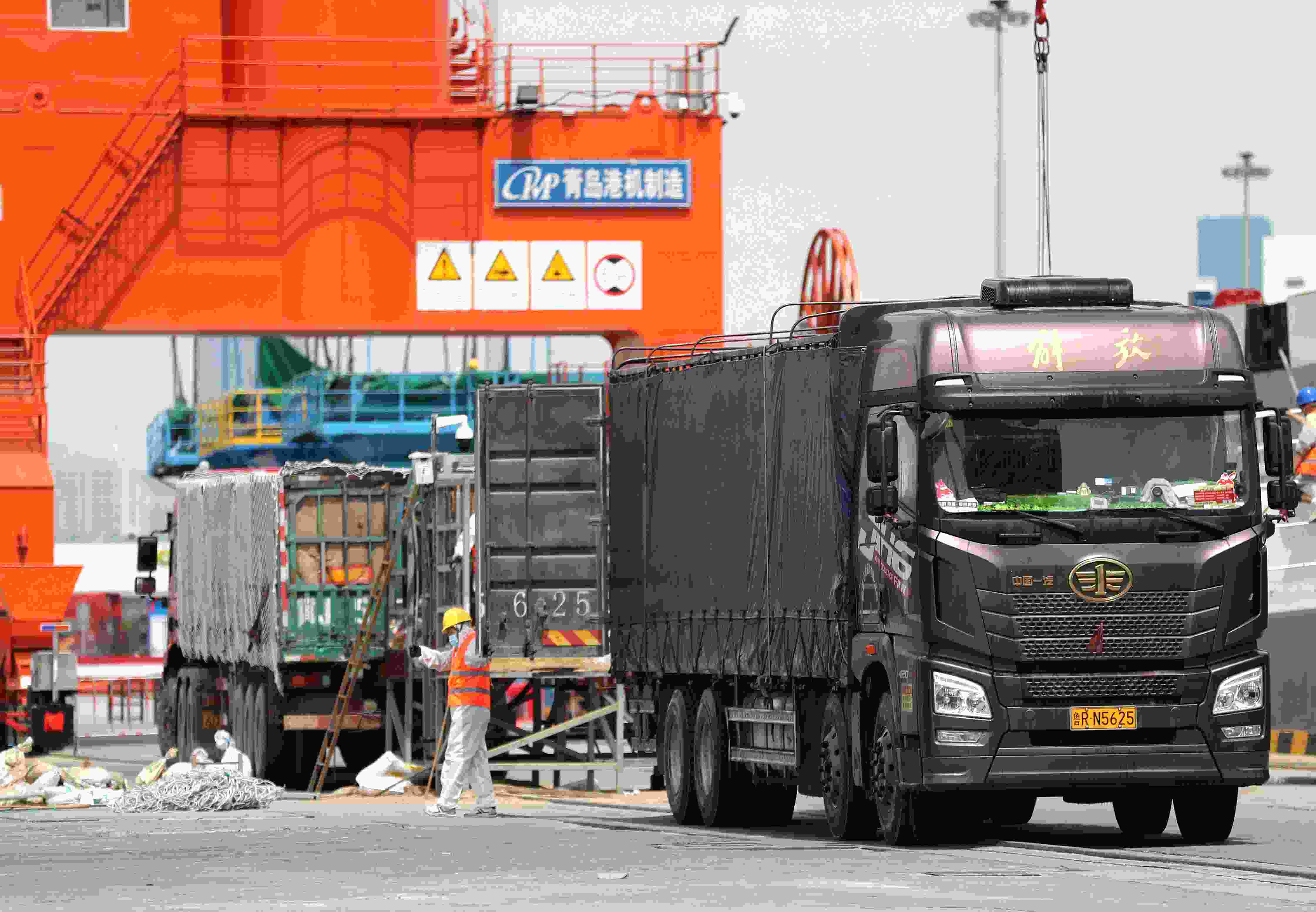 5月8日,在山東港口青島港前灣集裝箱碼頭,3000余頭活牛卸船轉(zhuǎn)運。
