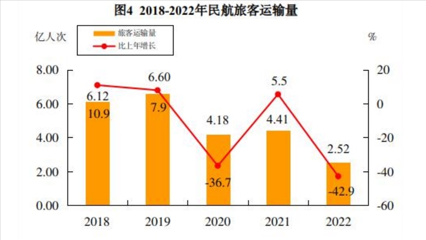 2018年至2022年民航旅客運(yùn)輸量。來(lái)源于2022年民航行業(yè)發(fā)展統(tǒng)計(jì)公報(bào)