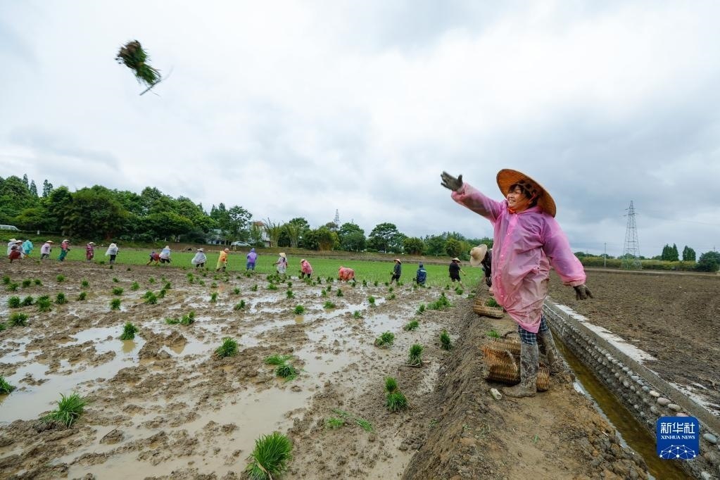 5月9日,在四川省崇州市道明鎮(zhèn)協(xié)和社區(qū),農(nóng)民向一片高標(biāo)準(zhǔn)農(nóng)田里拋水稻秧苗,以方便其他農(nóng)民插秧。