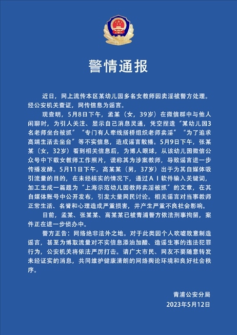 ·上海青浦警方:網(wǎng)傳幼兒園多名女教師賣淫被處理系謠言,刑拘3人。