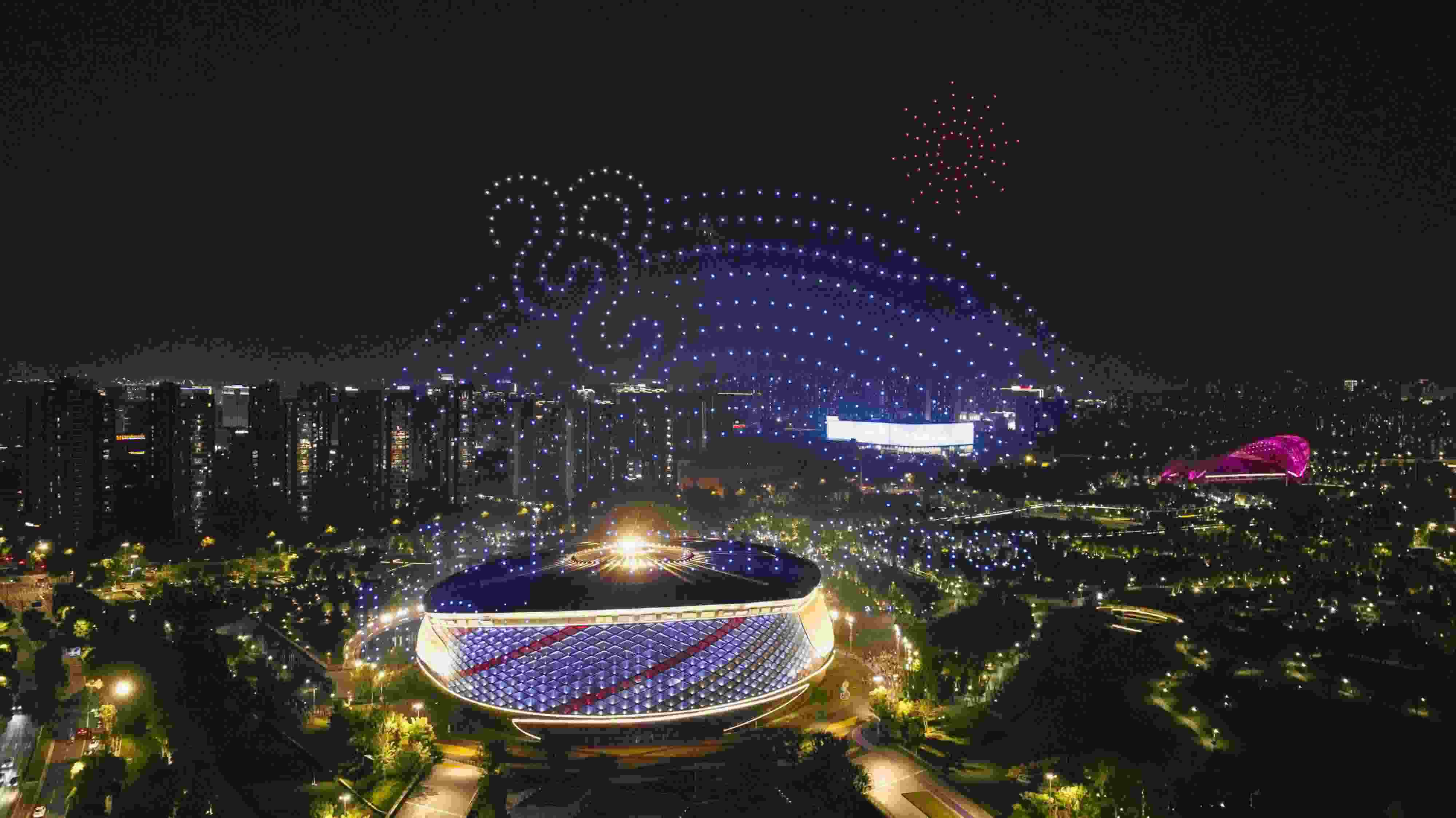 2023年5月13日,杭州亞運會乒乓球比賽場地——拱墅運河體育公園體育館上空上演無人機燈光秀表演。 視覺中國
