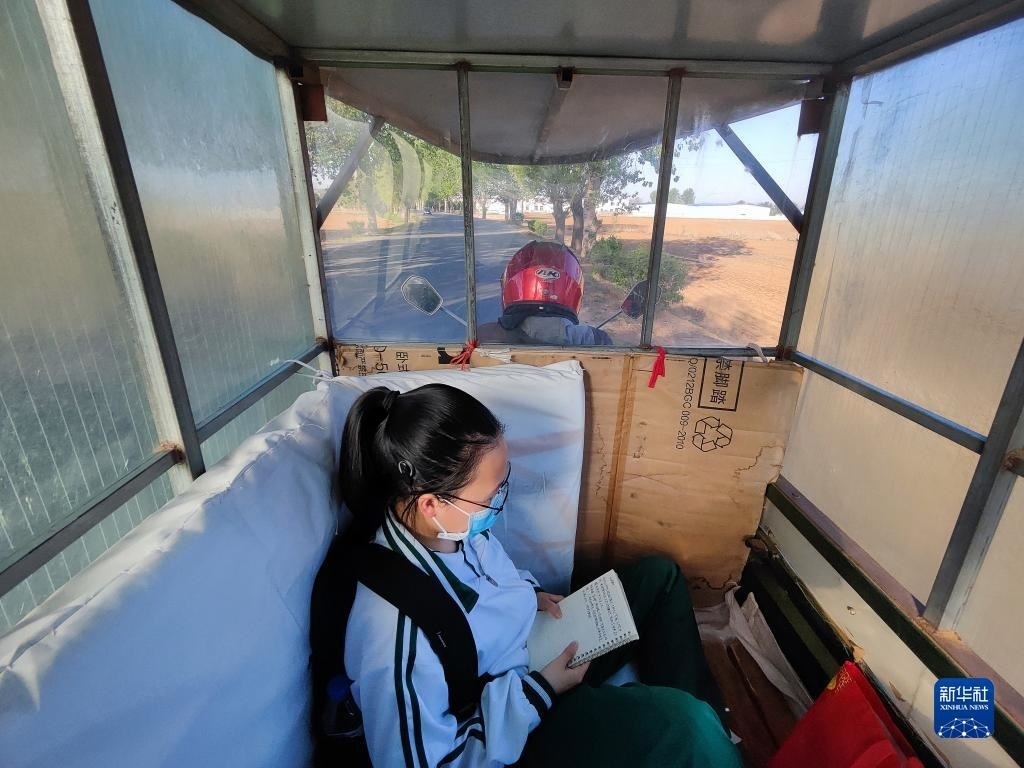 清晨,張連琴騎著電動三輪車拉著女兒李昕偉去上學,女兒在車棚內(nèi)背誦詩詞(5月8日手機拍攝)。