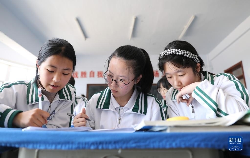 女兒李昕偉(中)課間和同學們交流習題,由于聽不太清,她需要目不轉(zhuǎn)睛地盯著同學的筆(5月8日攝)。