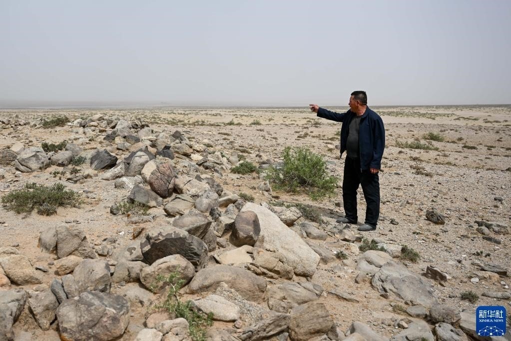 5月13日,駝峰(長城)文物保護(hù)隊(duì)員許繼龍(右)和烏仁其其格在巡查阿拉善左旗一處石圈遺址。