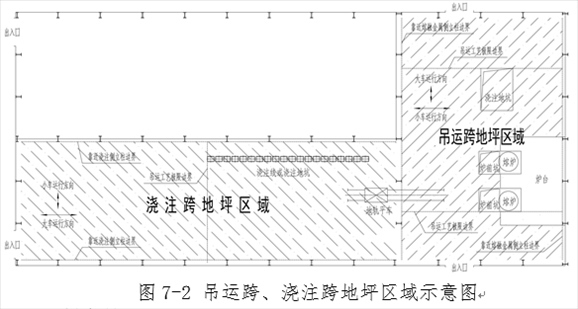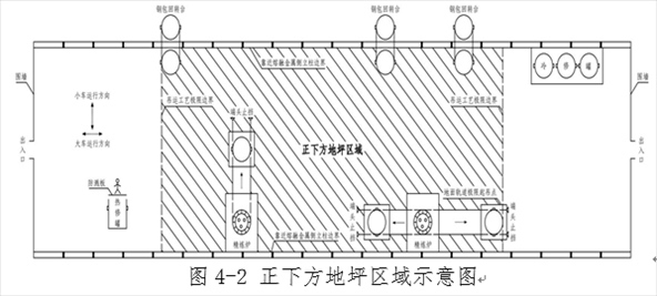 注:“正下方地坪區(qū)域”是指橫向以吊運(yùn)跨兩側(cè)立柱靠近熔融金屬吊運(yùn)側(cè)的立柱邊線為界,縱向以吊運(yùn)跨最兩端的鐵水、鋼水、液渣吊運(yùn)工藝極限邊界為界的車間地坪區(qū)域(圖4-2)。