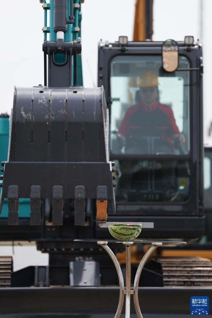 5月13日,在長(zhǎng)沙國(guó)際工程機(jī)械展覽會(huì)上,機(jī)手駕駛挖掘機(jī)切西瓜。
