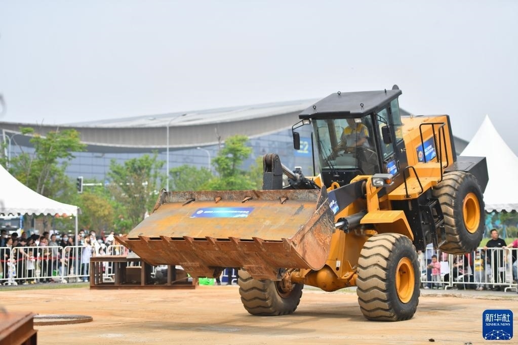 5月13日,在長(zhǎng)沙國(guó)際工程機(jī)械展覽會(huì)上,機(jī)手駕駛裝載機(jī)表演。