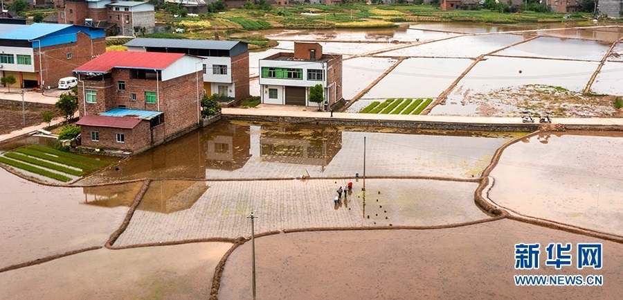 初夏時節(jié),廟宇鎮(zhèn)農戶在農田里插秧忙。新華網(wǎng)發(fā)(朱云平 攝)