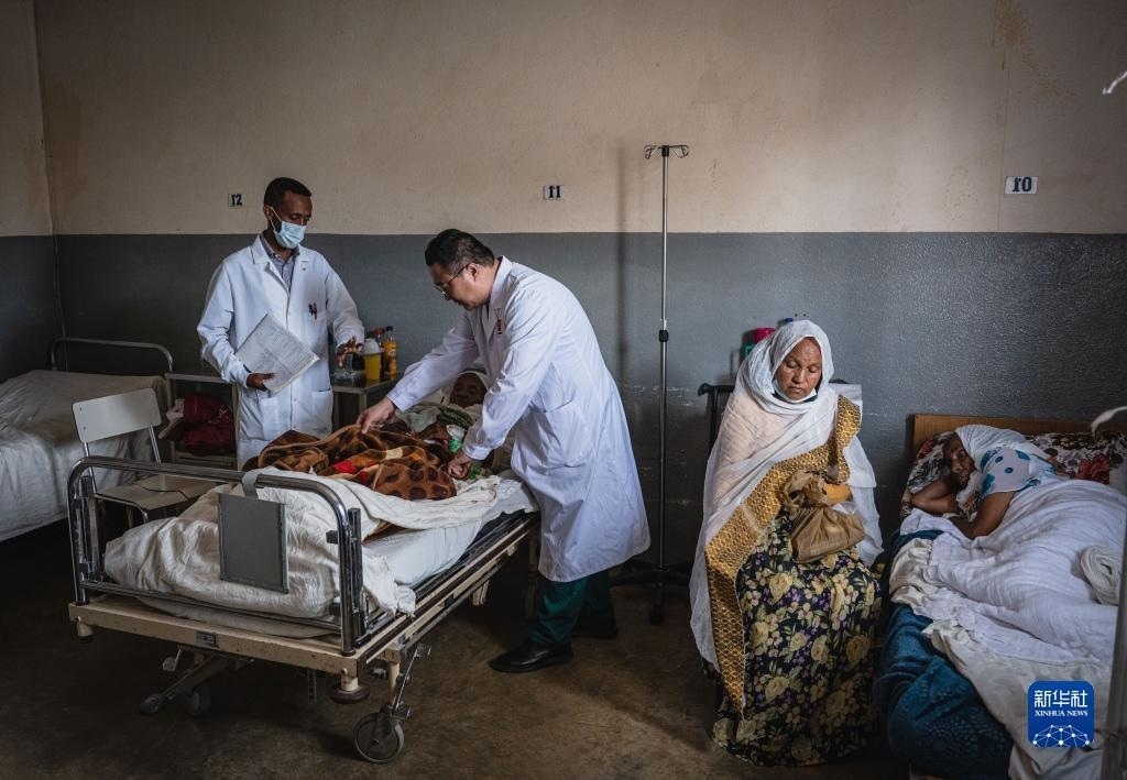 5月9日,在厄立特里亞首都阿斯馬拉的哈利貝特醫(yī)院,醫(yī)療隊(duì)泌尿外科醫(yī)生李龔龍(中)為患者做檢查。