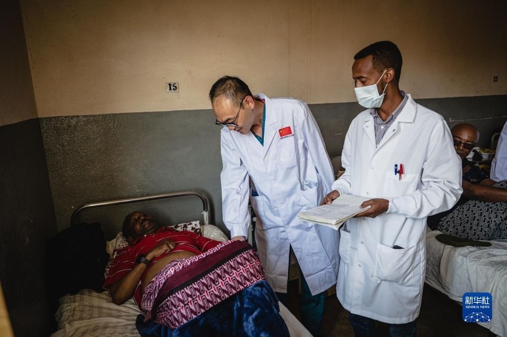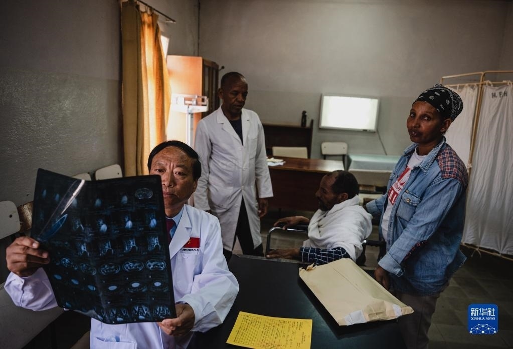 5月9日,在厄立特里亞首都阿斯馬拉的哈利貝特醫(yī)院,醫(yī)療隊(duì)隊(duì)長、脊柱外科醫(yī)生朱振軍(前)為患者做檢查。