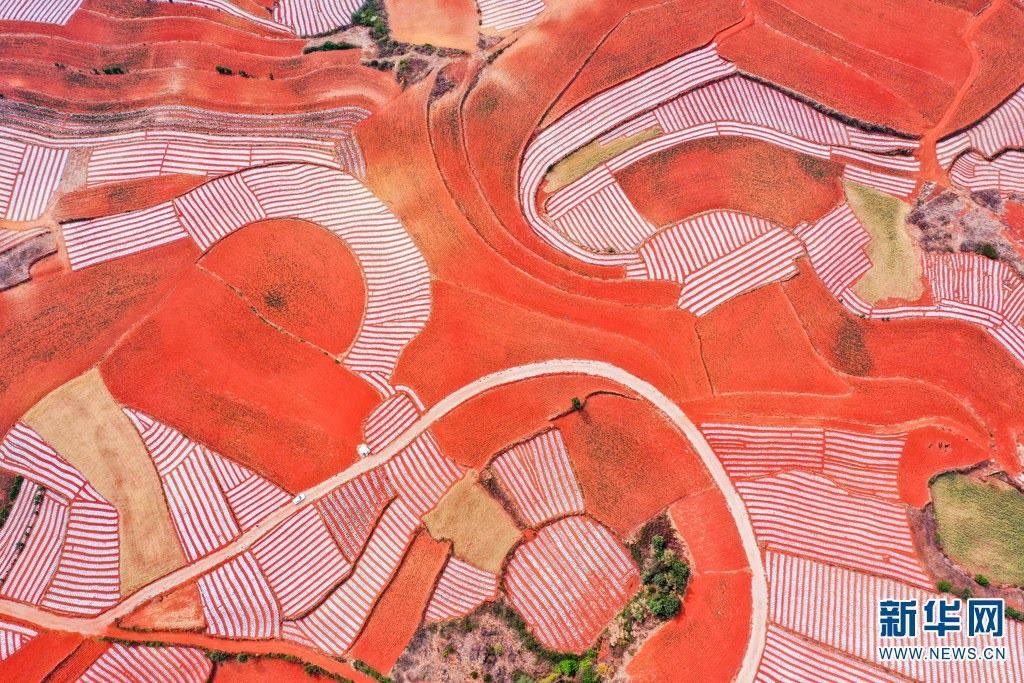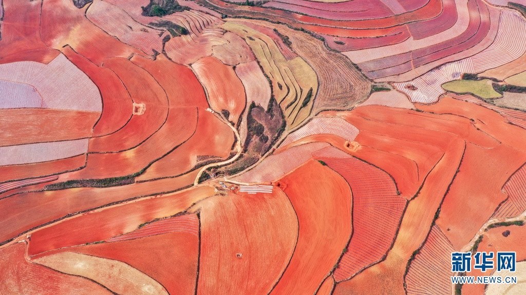 云南省尋甸回族彝族自治縣,連綿不斷的旱梯田遍布山間,遠接天邊,每年4-5月,經(jīng)過村民翻新、平整后的紅褐色土地,從空中俯瞰五彩斑斕、蔚為壯觀。當?shù)卮迕裥燎诟旁诜饰值募t土地上,用勤勞的雙手,繪就一幅幅勞動藝術(shù)畫作。新華網(wǎng)發(fā)(孫文來 攝影報道)