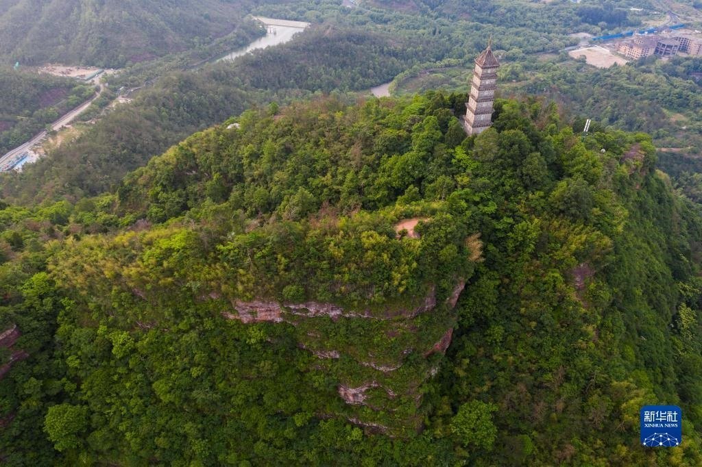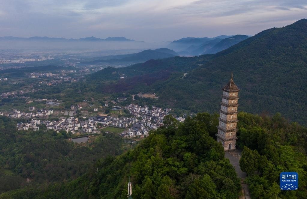 俯瞰天臺(tái)縣的赤城山及山頂?shù)牧哄?月16日攝,無(wú)人機(jī)照片)。