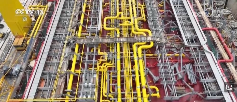 這艘船除了大,技術也十分先進。這上面有一些密密麻麻的管道,是用來處理加工從海底開采出來的原油,再進行提煉、分離。其實,我們可以通俗理解它就是一個海上可以移動的化工廠。