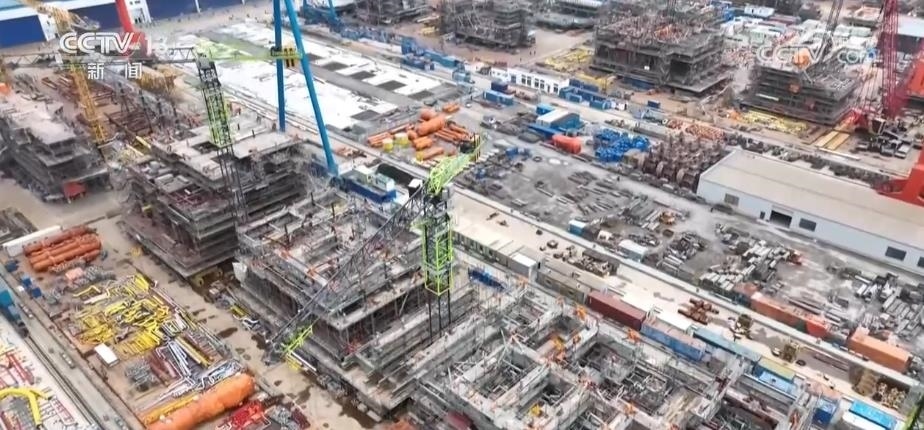這些大家伙,都是世界技術比較領先的一些海工裝備。通過航拍的鏡頭,給大家展現(xiàn)一下,最遠的是圓筒形超深水鉆探平臺。因為它的外形是獨特的圓筒型設計,所以它的抗風浪性、作業(yè)水深的能力非常得好,技術指標創(chuàng)下多項世界第一。這家企業(yè),一共向國外交付了6艘同類型的產(chǎn)品。