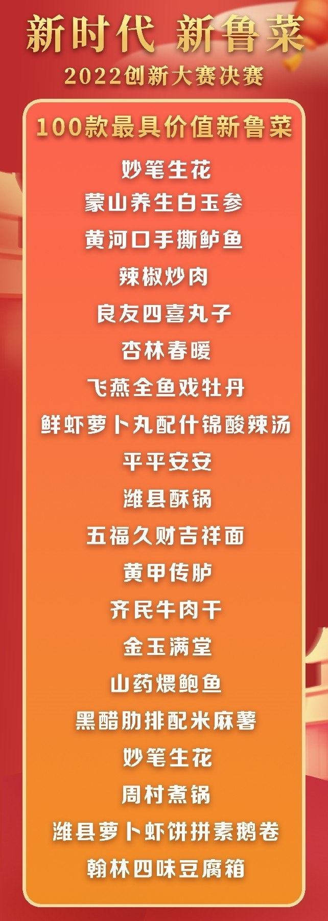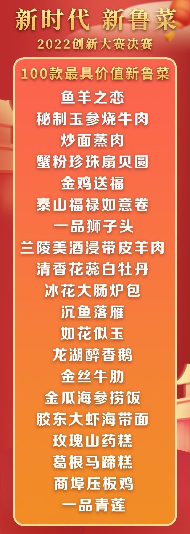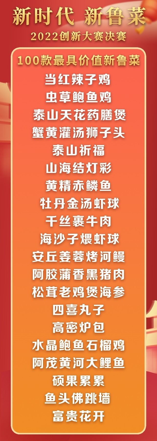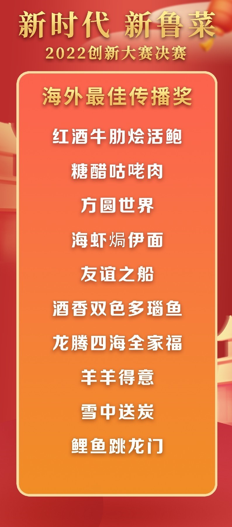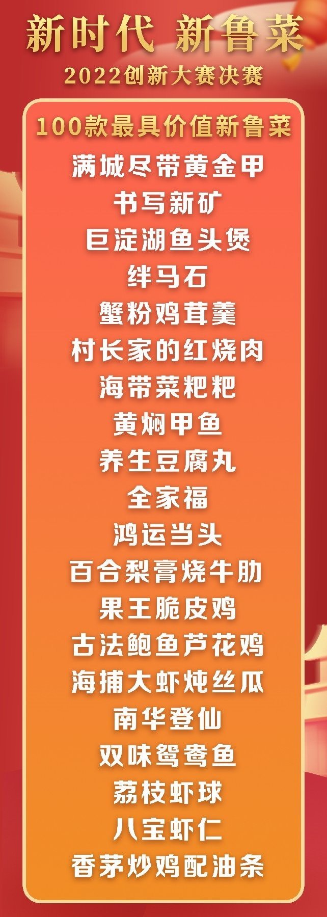 5月18日至19日,“新時代 新魯菜”2022創(chuàng)新大賽決賽暨頒獎活動在山東省濰坊市峽山區(qū)成功舉行,標(biāo)志著本屆大賽圓滿結(jié)束。經(jīng)過激烈角逐,大賽最終頒發(fā)出2022年度“十大魯菜創(chuàng)新菜品”、“20款我最喜愛的新魯菜”、“100款最具價值新魯菜”、“十大創(chuàng)新面點”、“預(yù)制菜轉(zhuǎn)化創(chuàng)新獎”和“海外最佳傳播獎”等獎項。此外,大賽組委會還頒發(fā)了“最佳組織獎”、“融媒貢獻獎”和“特殊貢獻獎”等獎項。