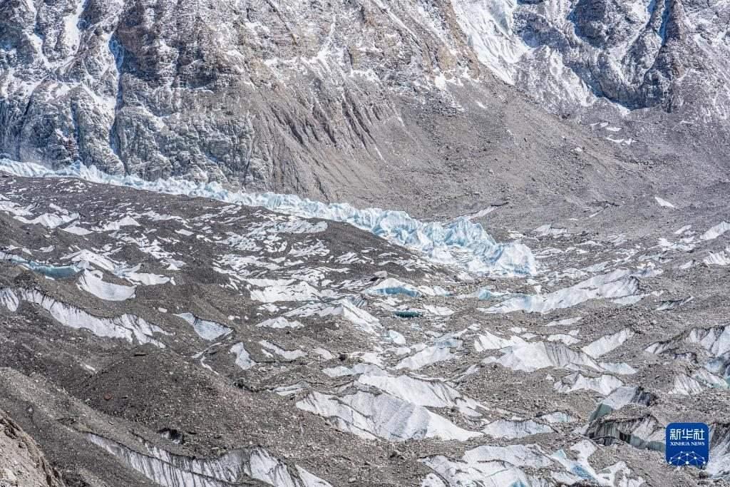 這是珠峰腳下中絨布冰川(左)和西絨布冰川(右)的匯合處(5月16日攝,無人機(jī)拼接照片)。