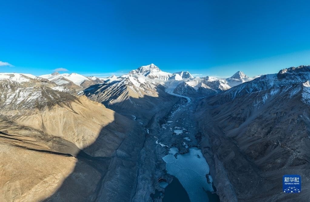 這是珠峰腳下的中絨布冰川(前)和西絨布冰川(后)(5月15日攝,無人機(jī)照片)。