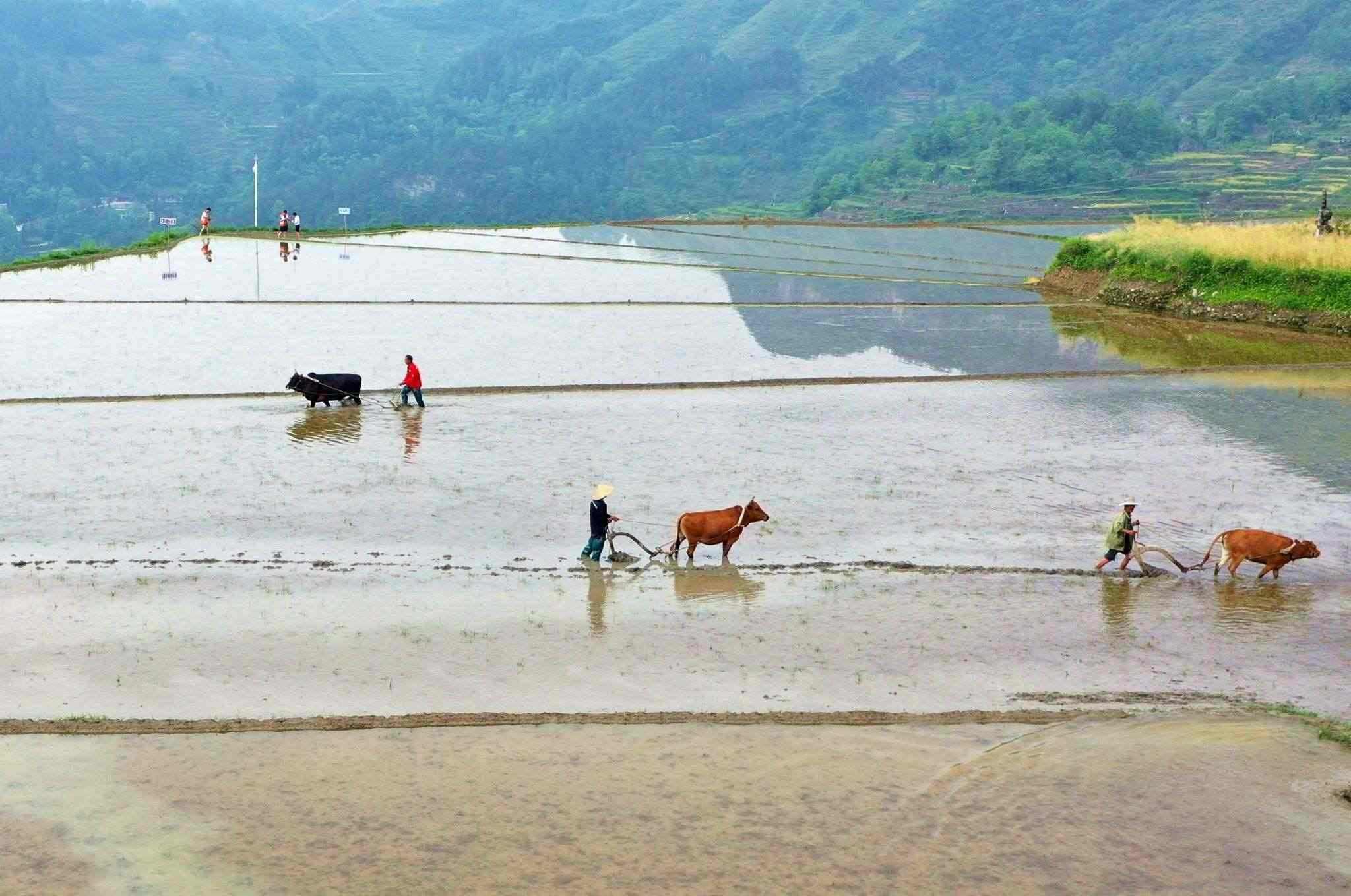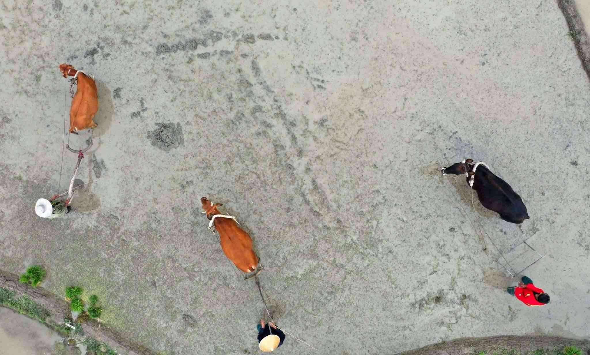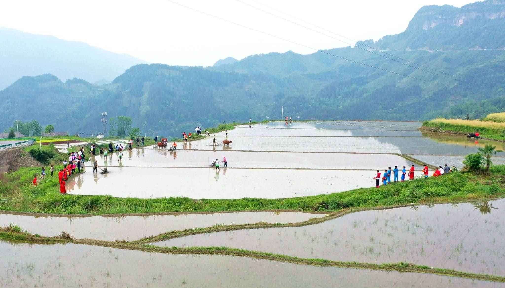 2023年5月19日,重慶,酉陽縣花田鄉(xiāng)何家?guī)r村的梯田里,村民們正在進(jìn)行犁田插秧比賽,向游客展示農(nóng)耕文化魅力。視覺中國(guó)