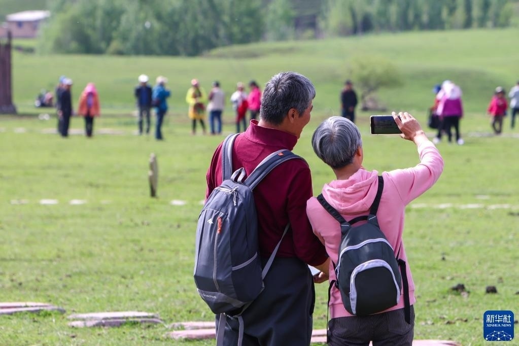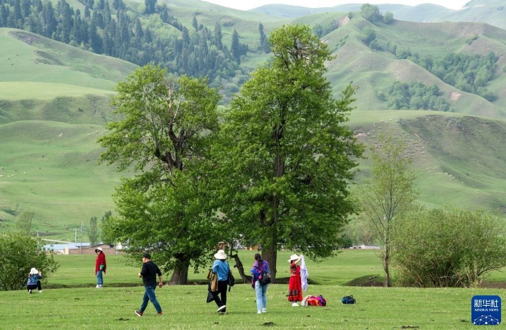 5月19日,游客在位于新疆新源縣的那拉提旅游風(fēng)景區(qū)觀光。   新華社記者 王菲 攝