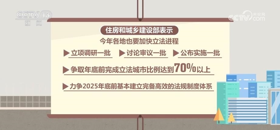住房城鄉(xiāng)建設部表示,2023年,各地也要加快立法進程,立項調(diào)研一批、討論審議一批、公布實施一批,爭取年底前完成立法城市比例達到70%以上,力爭2025年底前基本建立完備高效的法規(guī)制度體系。