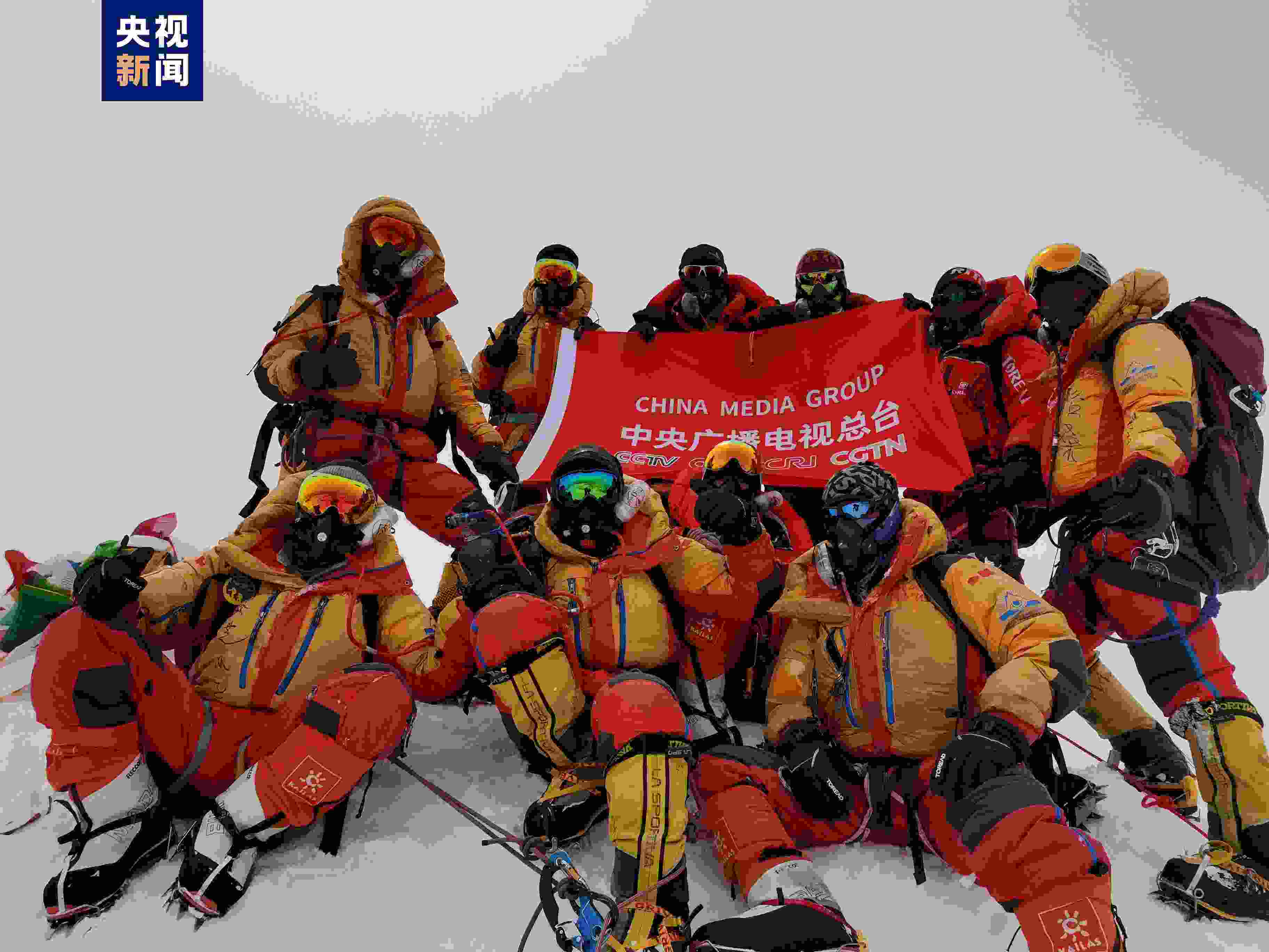 5月23日上午,2023“巔峰使命”珠峰科考登頂隊(duì)員在峰頂展示中央廣播電視總臺旗幟。