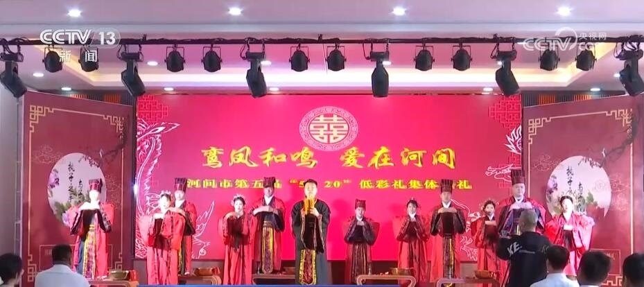 在江西貴溪、山東巨野等地,五月份組織了多場(chǎng)主題為“不要彩禮要幸?!钡募w婚禮,倡導(dǎo)新人們選擇簡(jiǎn)約的婚禮儀式。在河北省河間市的集體婚禮現(xiàn)場(chǎng),紅毯艷艷、絲竹裊裊,新人們身著傳統(tǒng)禮服,在證婚人、主婚人的見證下,按照周制漢婚的傳統(tǒng)儀式開啟他們愛的旅程。