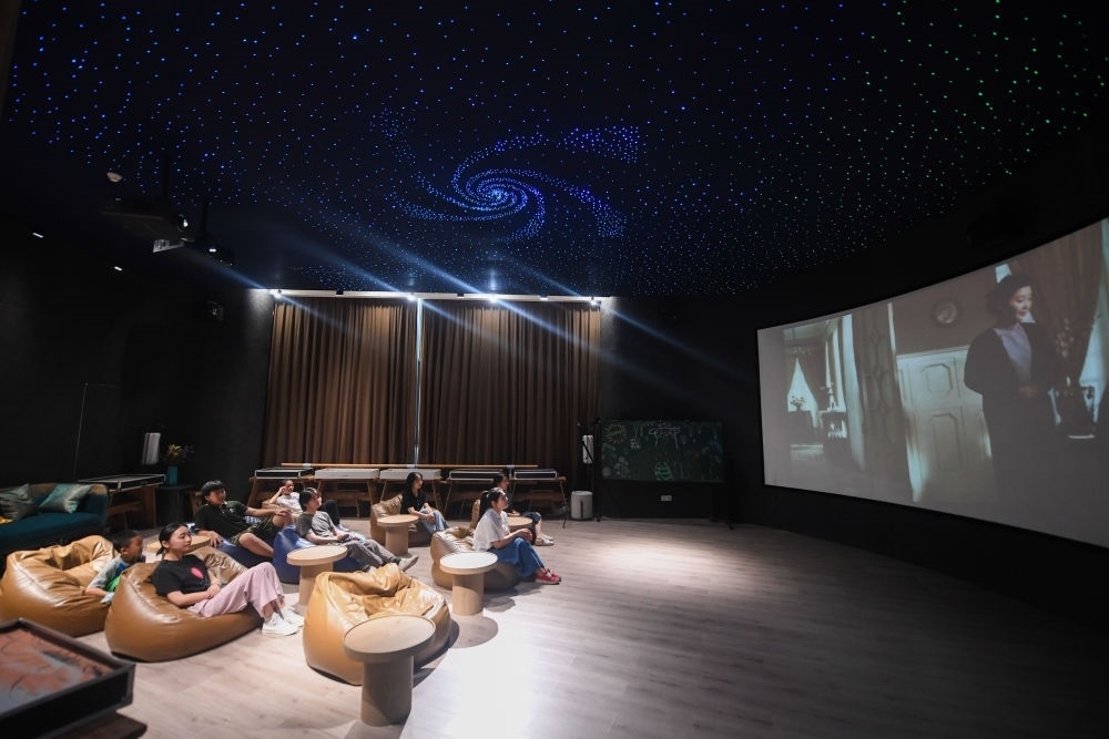 居民在位于浙江省杭州市富陽區(qū)銀湖街道硅谷社區(qū)的“合之舍”書房的影視廳觀看電影,該書房是銀湖街道“15分鐘品質文化生活圈”的示范點位(2022年7月2日攝)。新華社記者 徐昱 攝