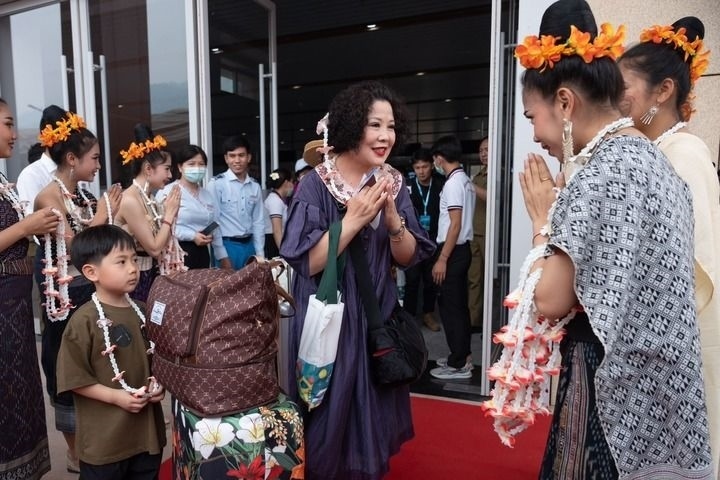 在中老鐵路老撾磨丁站,工作人員歡迎乘坐D887次國際旅客列車的旅客抵達磨?。?023年4月13日攝)。新華社發(fā)(凱喬 攝)
