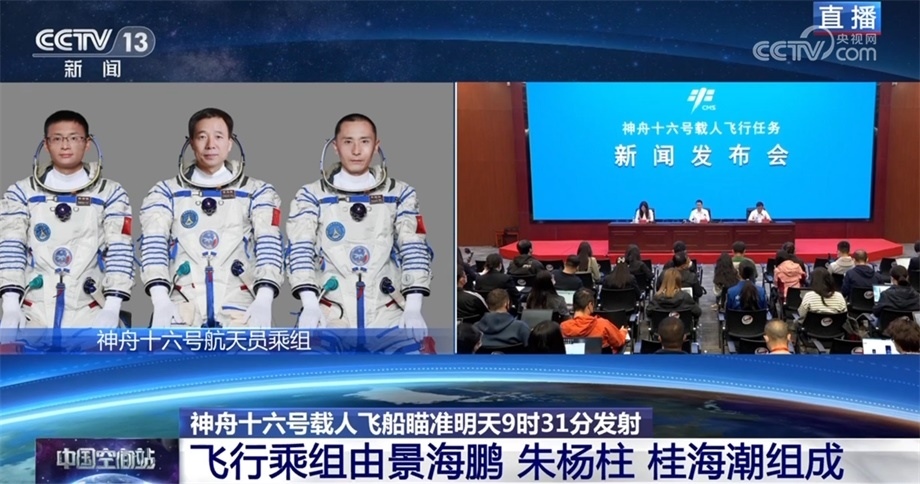 中國載人航天工程辦公室副主任、工程新聞發(fā)言人 林西強:受任務(wù)總指揮部委托,由我向大家介紹神舟十六號載人飛行任務(wù)有關(guān)情況。經(jīng)總指揮部研究決定,瞄準北京時間5月30日9時31分發(fā)射神舟十六號載人飛船,飛行乘組由航天員景海鵬、朱楊柱和桂海潮組成,景海鵬擔(dān)任指令長。航天員景海鵬先后參加過神舟七號、九號、十一號載人飛行任務(wù),朱楊柱和桂海潮都是首次飛行。目前,執(zhí)行此次發(fā)射任務(wù)的長征二號F遙十六火箭即將開始加注推進劑。