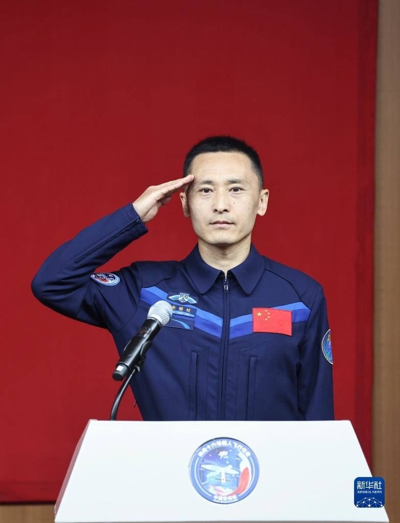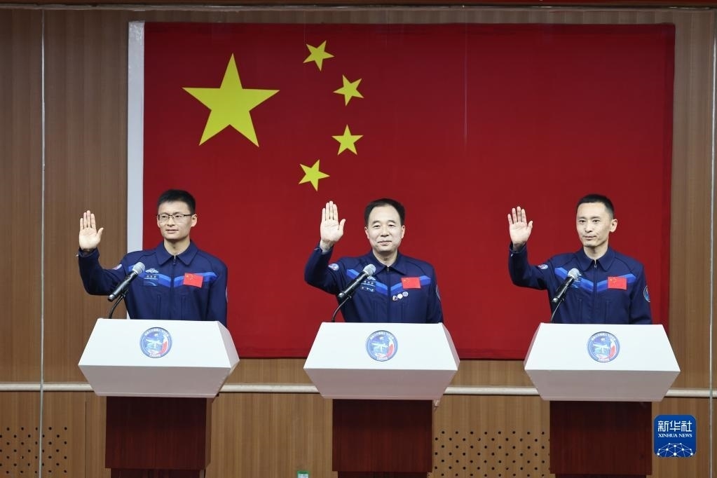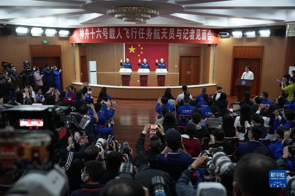 5月29日,神舟十六號(hào)航天員乘組與中外媒體記者集體見面會(huì)在酒泉衛(wèi)星發(fā)射中心問天閣舉行。這是指令長(zhǎng)景海鵬(中)、航天飛行工程師朱楊柱(右)、載荷專家桂海潮揮手致意。   新華社記者 金立旺 攝