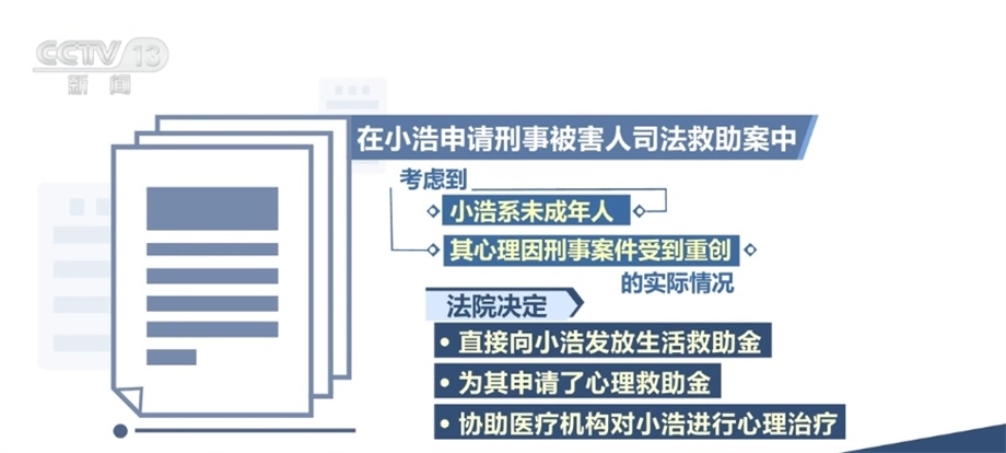 在此次發(fā)布的保護(hù)未成年人權(quán)益司法救助典型案例中,還涉及針對向未成年人提供專門心理救助金、提供心理危機(jī)干預(yù)等立體幫扶,進(jìn)一步延伸司法服務(wù)。在小浩申請刑事被害人司法救助案中,小浩的父親被害,其本人亦受到人身傷害,法院作出刑事附帶民事判決,判處被告人死刑,并判決其賠償附帶民事訴訟原告人經(jīng)濟(jì)損失13萬余元。后經(jīng)調(diào)查,被告人無財(cái)產(chǎn)可供執(zhí)行??紤]到小浩系未成年人,其心理因刑事案件受到重創(chuàng)的實(shí)際情況,法院除決定直接向小浩發(fā)放生活救助金外,還為其申請了心理救助金,協(xié)助醫(yī)療機(jī)構(gòu)對小浩進(jìn)行心理治療。