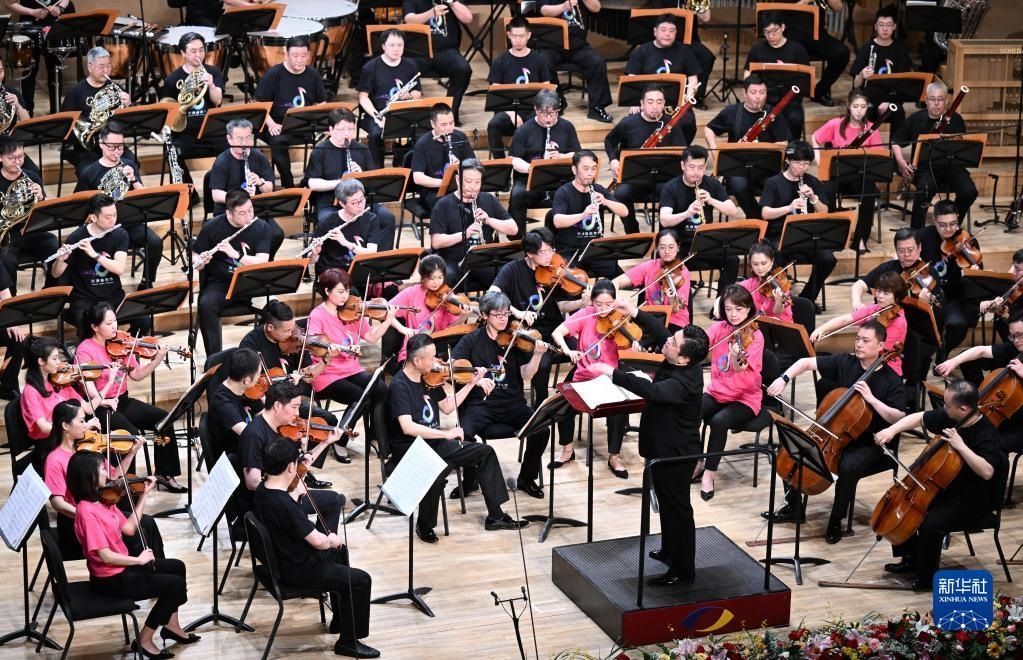 5月25日,在天津大劇院音樂廳,由天津歌舞劇院、天津交響樂團(tuán)等組成的天津百人聯(lián)合樂團(tuán)在舞臺(tái)上演奏。