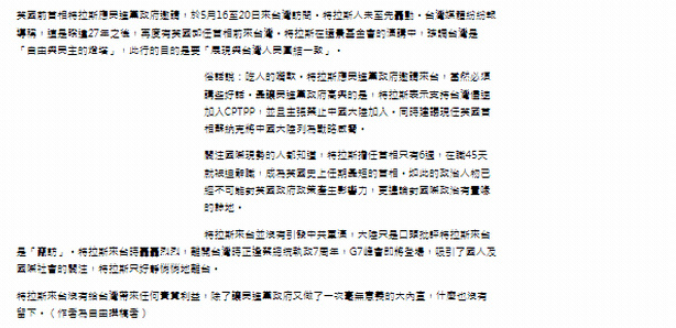 這兩天,譚主發(fā)現(xiàn)臺灣中時新聞網(wǎng)刊發(fā)了一篇快評文章:《特拉斯悄悄走了》。文章說到:特拉斯來臺沒有給臺灣帶來任何實質利益,除了讓民進黨當局又做了一次毫無意義的大內宣,什么也沒有留下。